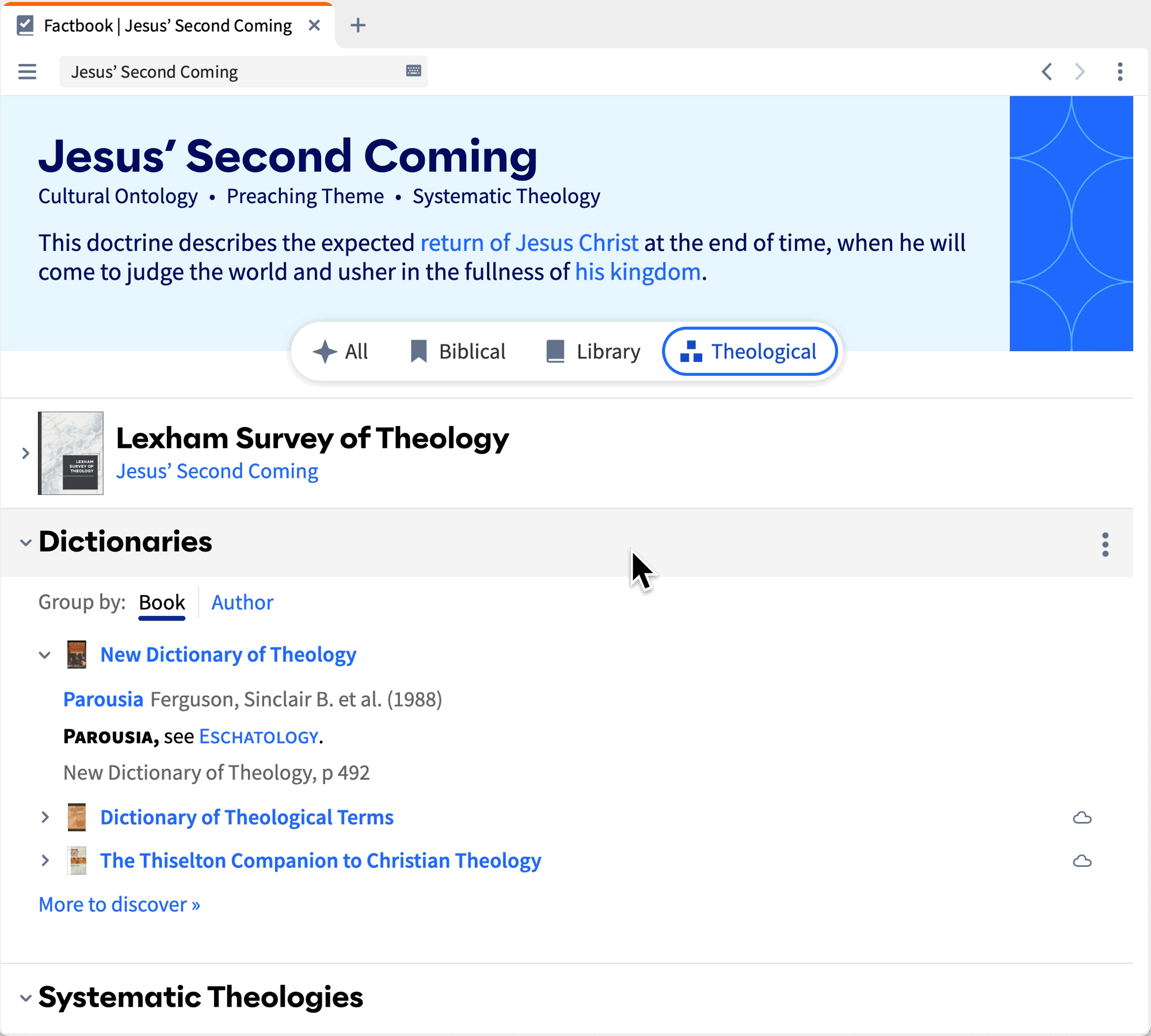 With the Theological Lens now expanded in Factbook to replace the Theology Guide, you can refer to theological resources in the same place you explore other perspectives.