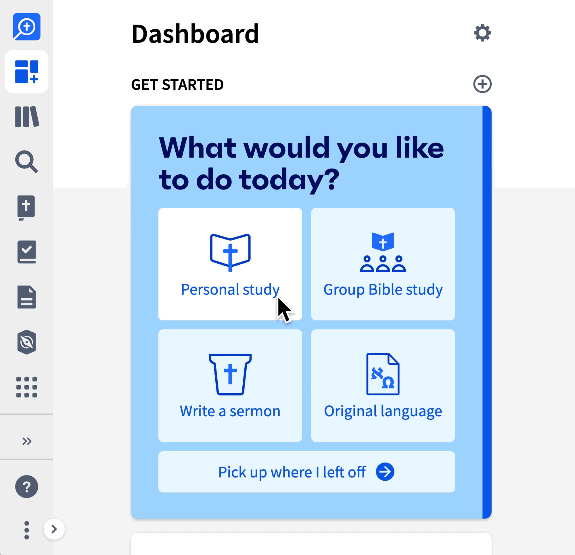 Jump right into study with the Get Started wizard. Choose from four options and then enter a passage, topic, or Greek or Hebrew lemma. The wizard will create a layout for you and explain how to make the most of it.Plan your sermons, organize them, prepare them, and preach them all from one place. The work you do in Sermon Builder and Sermon Manager now is more portable and more accessible, including editing on the go.